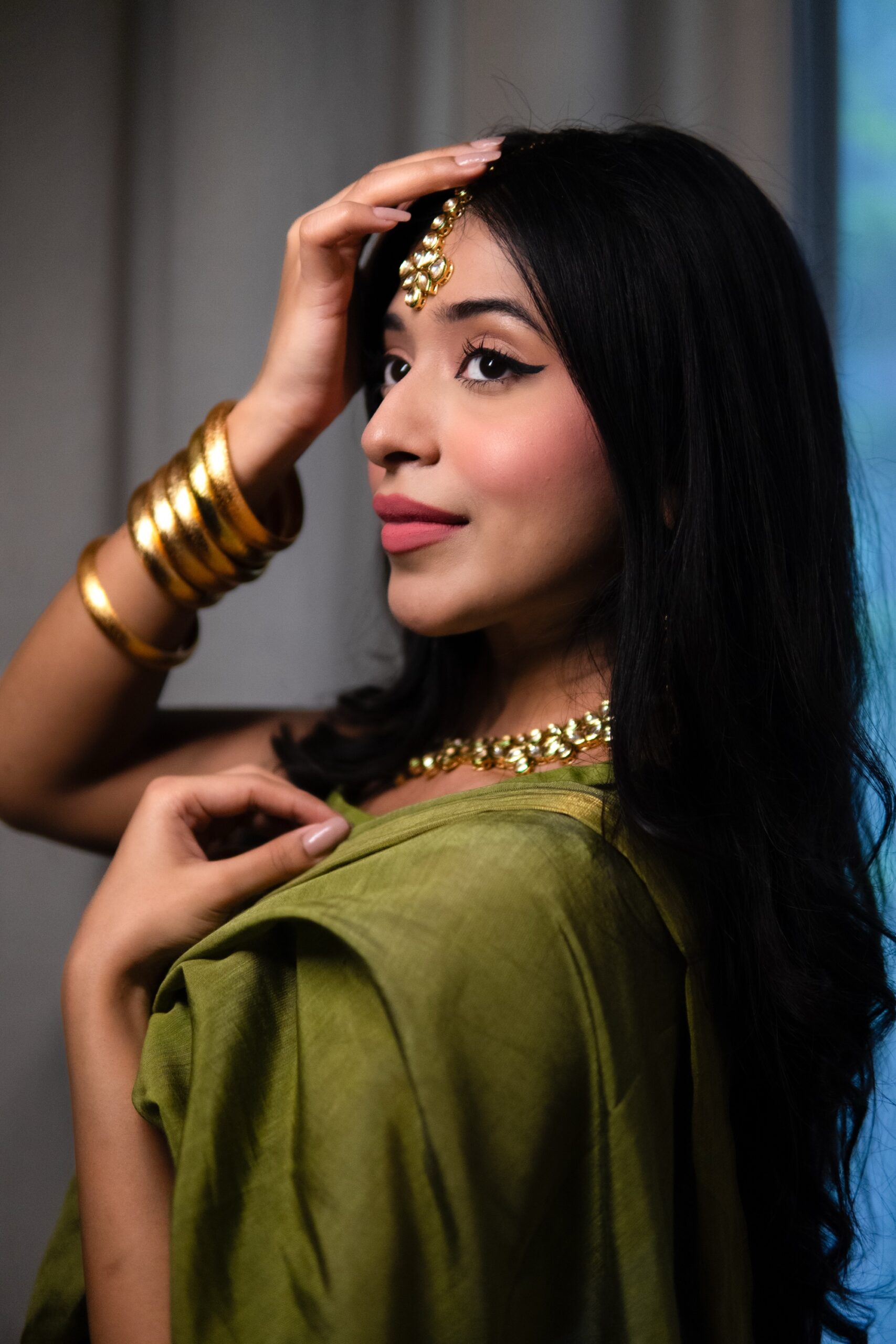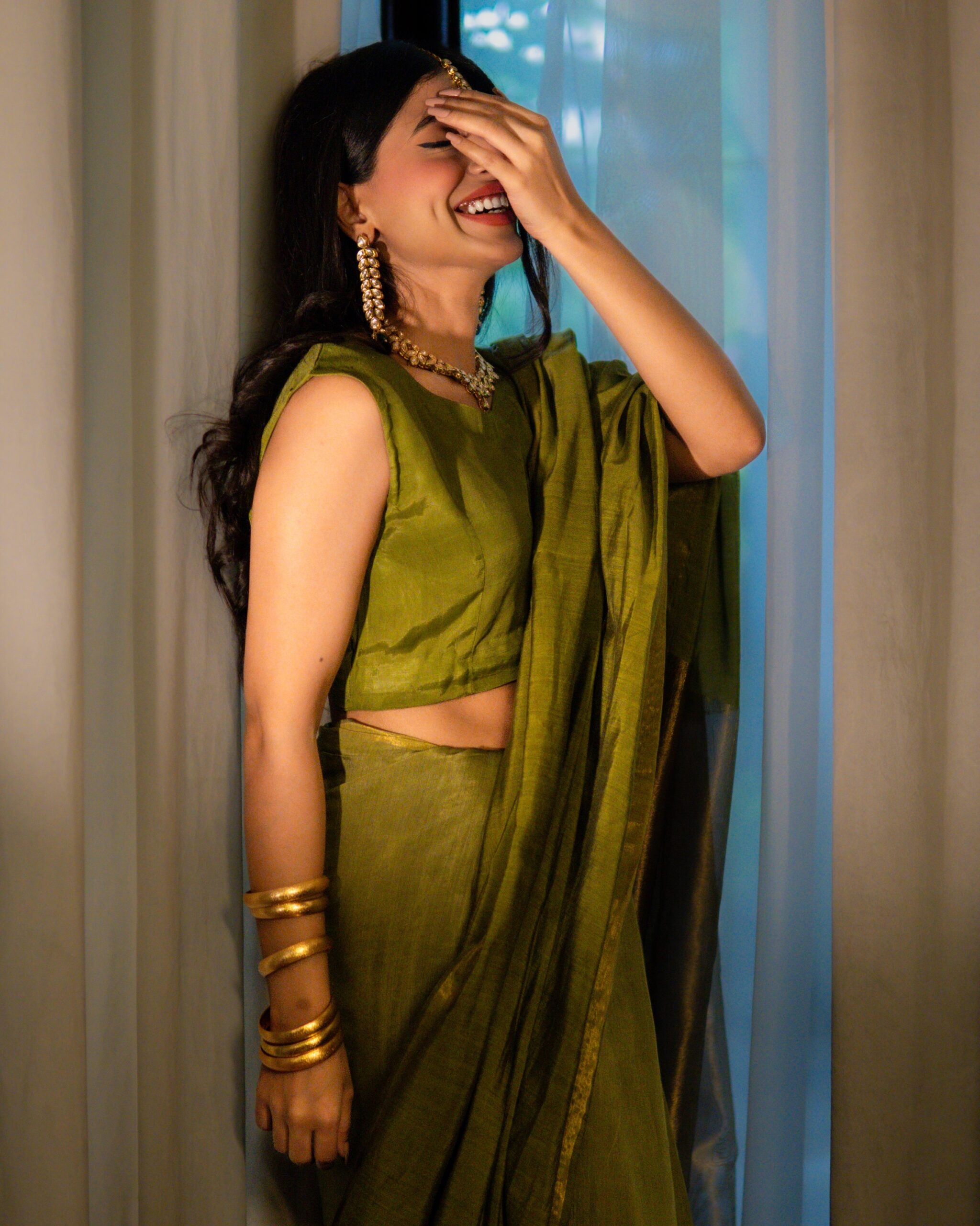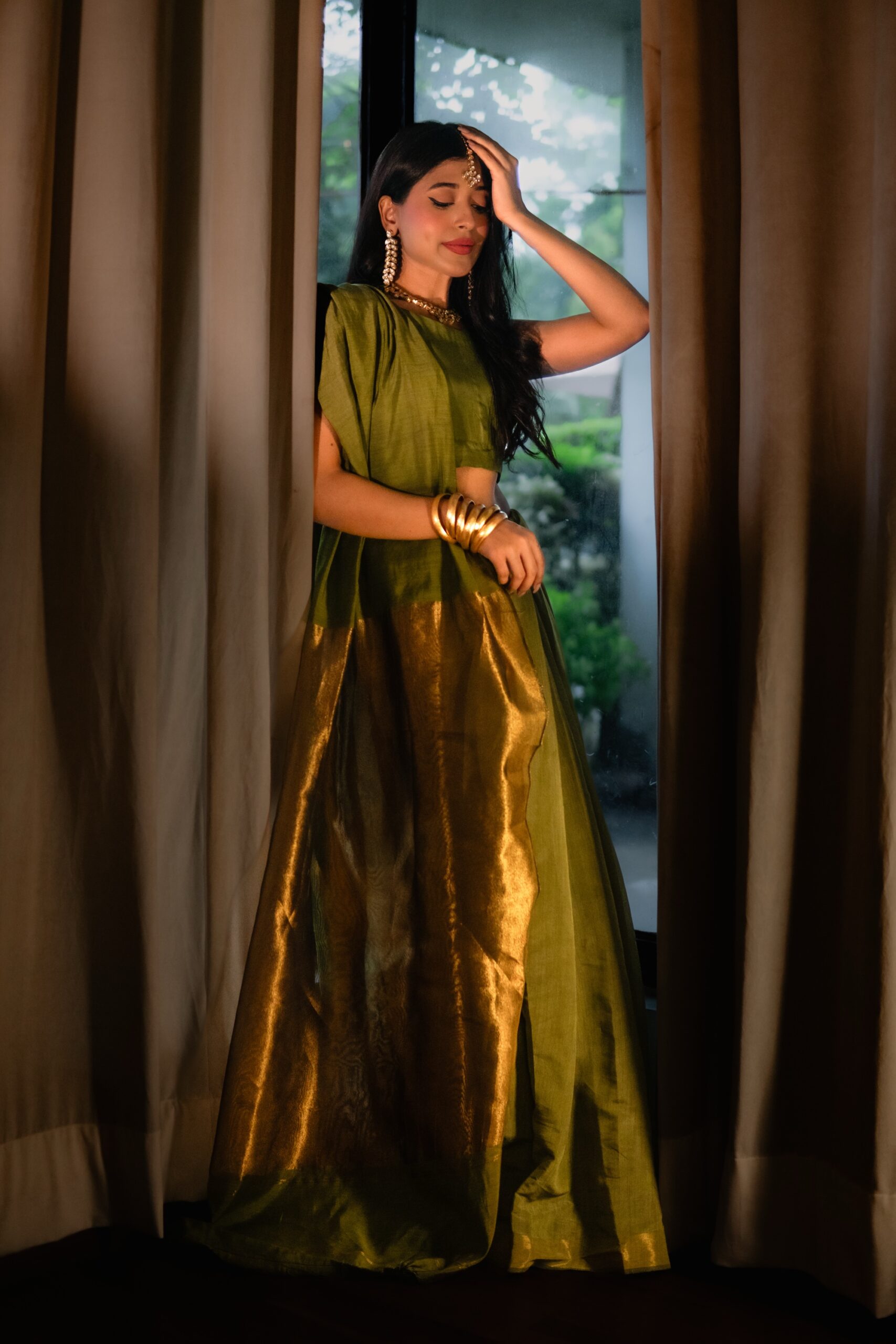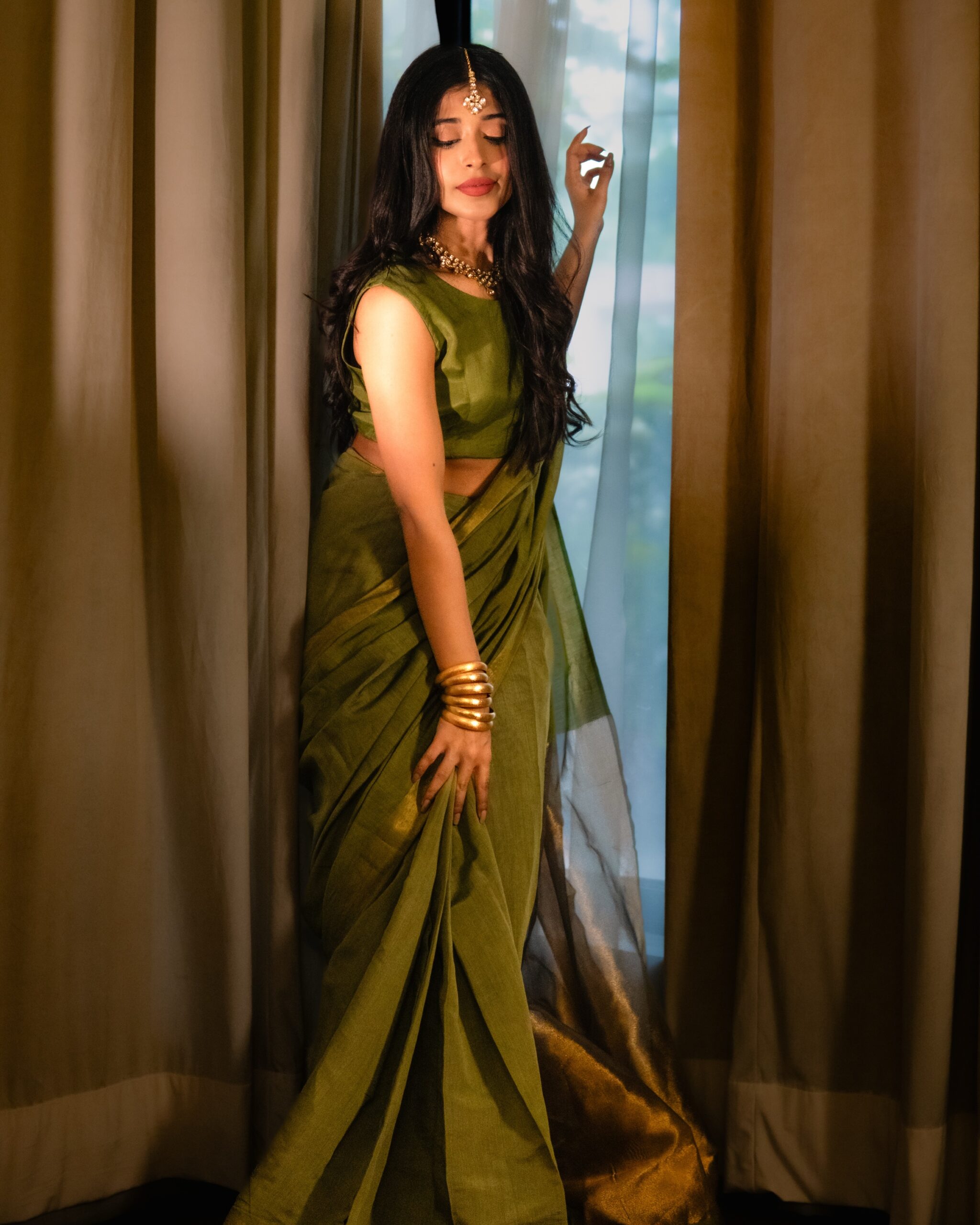 Dhaani is a olive Cotton silk saari that exudes timeless elegance. The saari’s body is smooth and lustrous, highlighted by the lavish gold zari border and richly woven messuri pallu, creating a striking interplay of color and craftsmanship. Traditional motifs and fine weaving give it a heritage charm, making it an heirloom-worthy piece.
