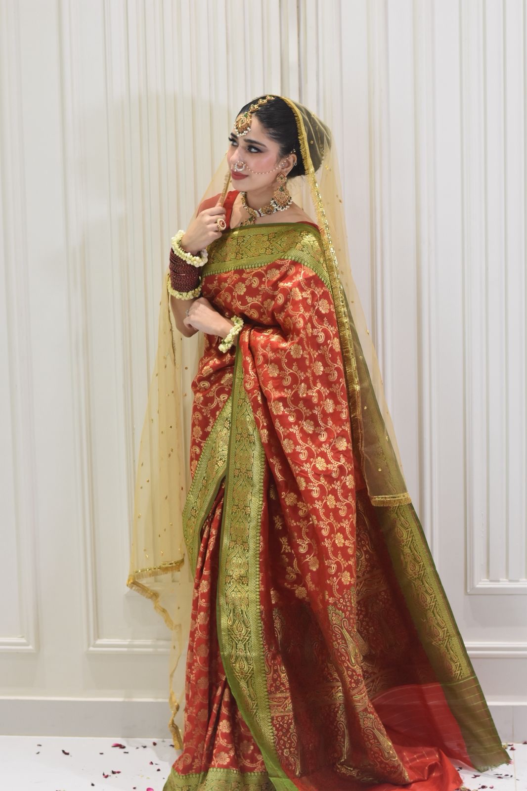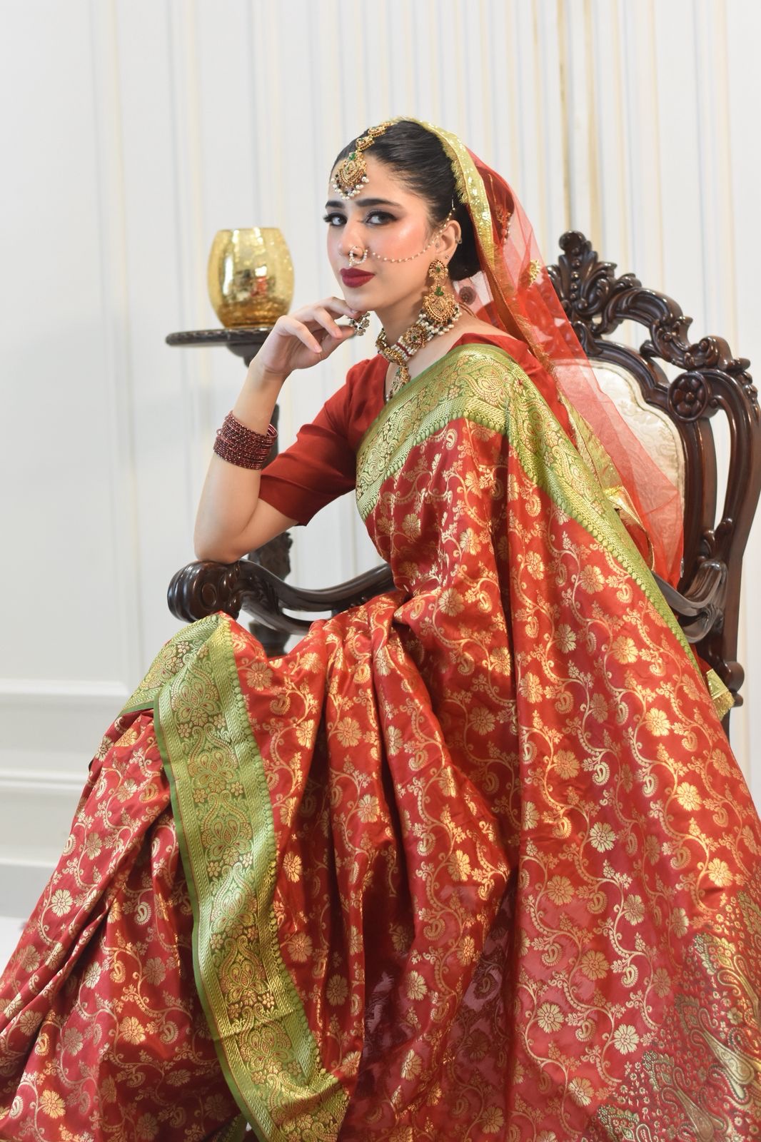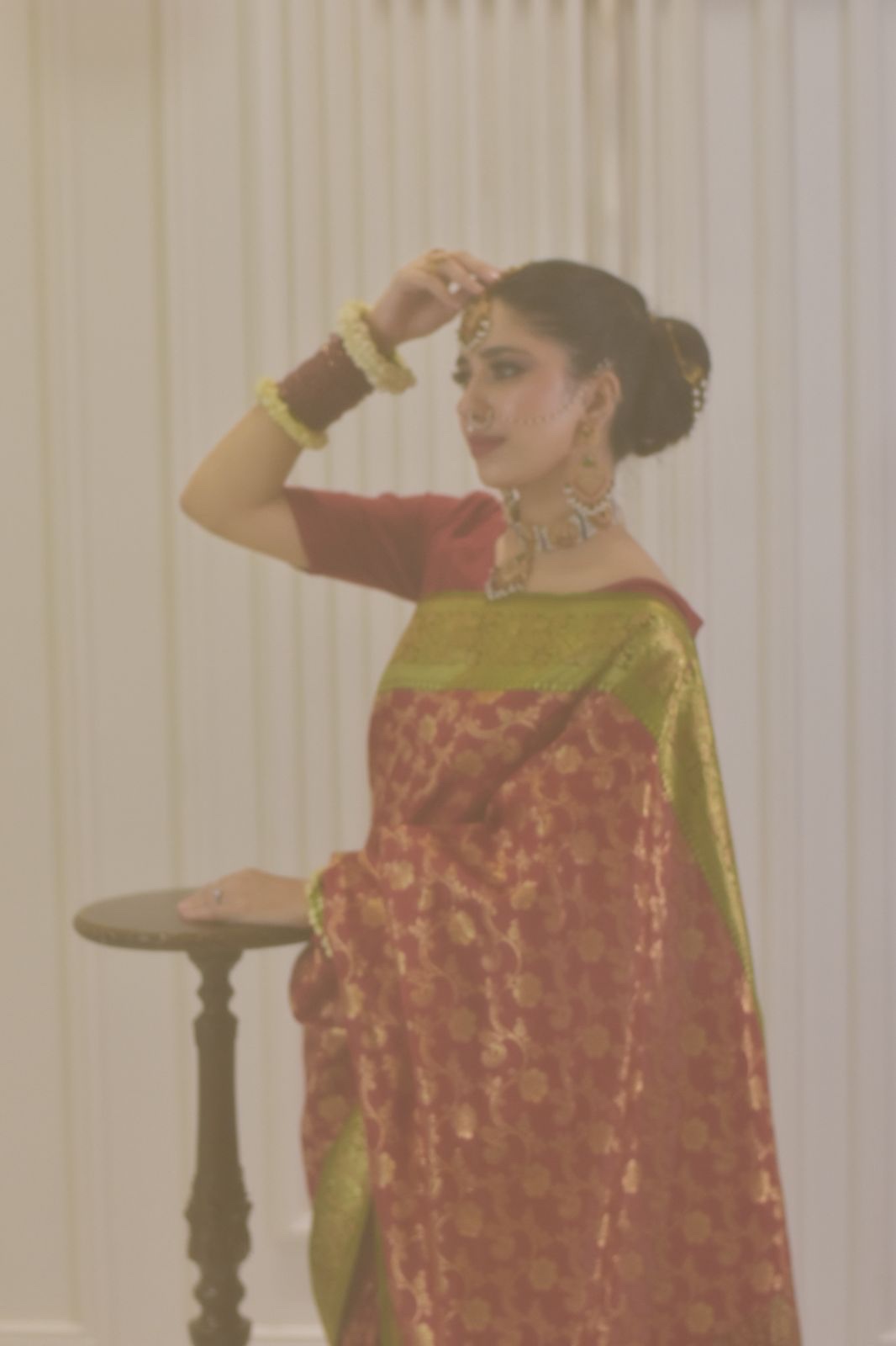 Husna is a premium Red Banarsi silk saari that exudes timeless elegance. The saari’s body is smooth and lustrous, highlighted by the lavish gold zari border and richly woven pallu, creating a striking interplay of color and craftsmanship. Traditional motifs and fine weaving give it a heritage charm, making it an heirloom-worthy piece.