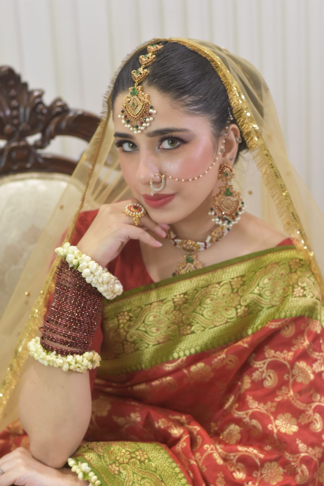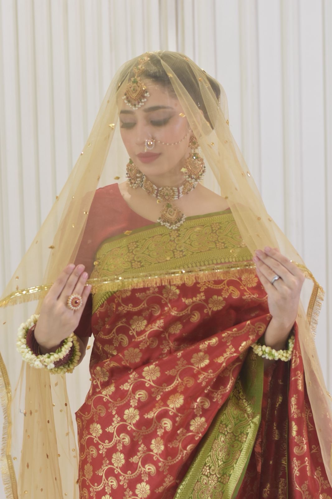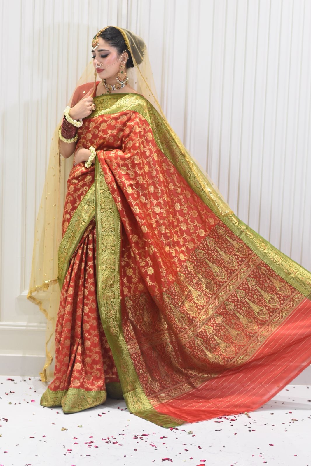 Husna is a premium Red Banarsi silk saari that exudes timeless elegance. The saari’s body is smooth and lustrous, highlighted by the lavish gold zari border and richly woven pallu, creating a striking interplay of color and craftsmanship. Traditional motifs and fine weaving give it a heritage charm, making it an heirloom-worthy piece.